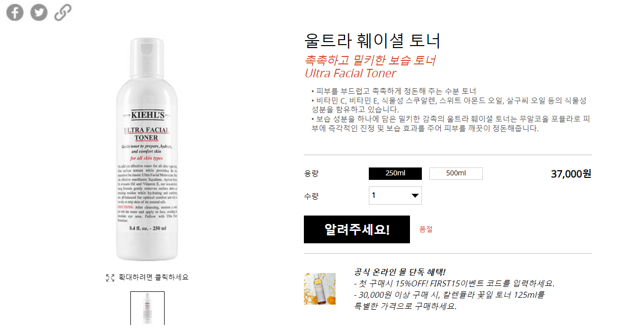 한국 공홈 기준 울트라 훼이셜 토너가 37000원이니 만천원정도 저렴!